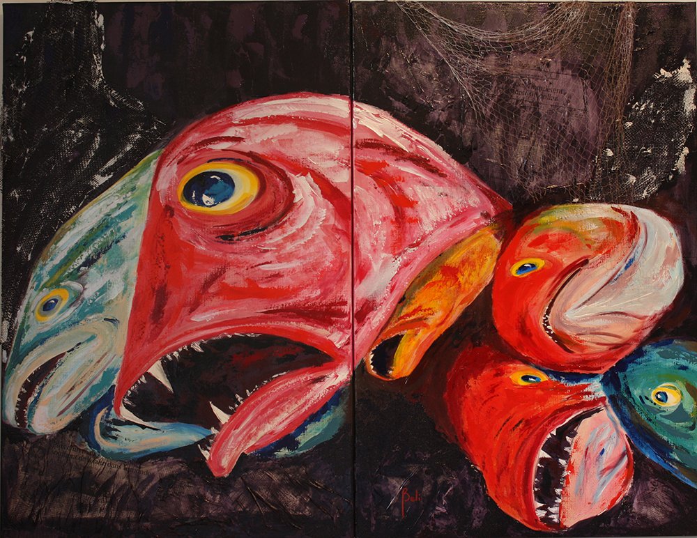 Toutes sortes d’animaux figurent dans cette collection au gré de mes envies et mes préférences. Toutefois elle met également l’accent sur des espèces en danger de raréfaction, voire d’extinction (autres que le requin) et particulièrement le diptyque ’End of the line", inspiré du film du même nom.