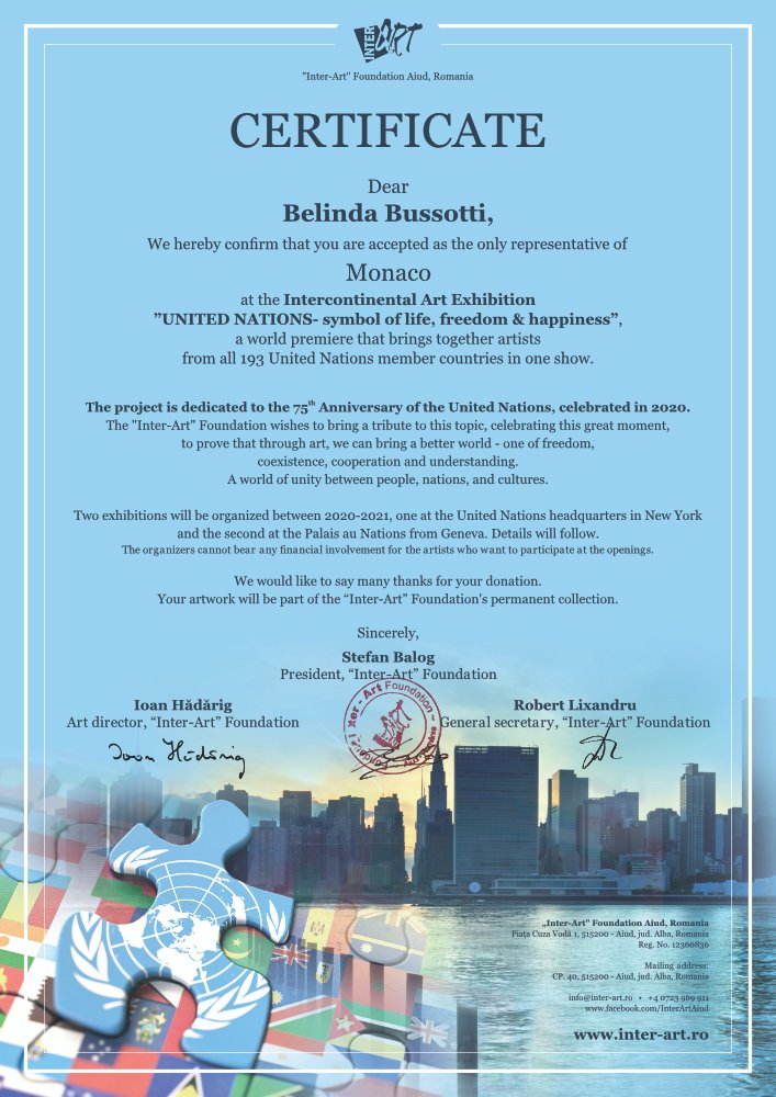 En 2019, Stefan Balog , président de « Inter Art - Foundation Aiud – Romania », m’avait officiellement demandé si j’accepterais d’être l’artiste qui représenterait Monaco pour une première mondiale : une exposition prévue en avril 2020 au siège des Nations Unies à New York, rassemblant 193 artistes pour les 193 pays de l’ONU qui allait fêter ses 75 ans !