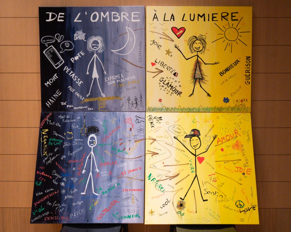 Ces 4 dernières toiles initiées par BELI et inspirées par le livre des "petits bonshommes allumettes" de Jacques Martel, veulent mettre en évidence les questions que se posent les lycéens sur ce sujet et les solutions possibles : "c’est quoi le harcèlement ? A partir de quel moment on se sent harcelé quand on est une fille ? quand on est un garçon ? Que faire pour que ça cesse ? Comment faire pour en sortir ? Que faire ou ne pas faire en tant que témoins ?". Une véritable prise de conscience et des messages, par le biais de l’Art.