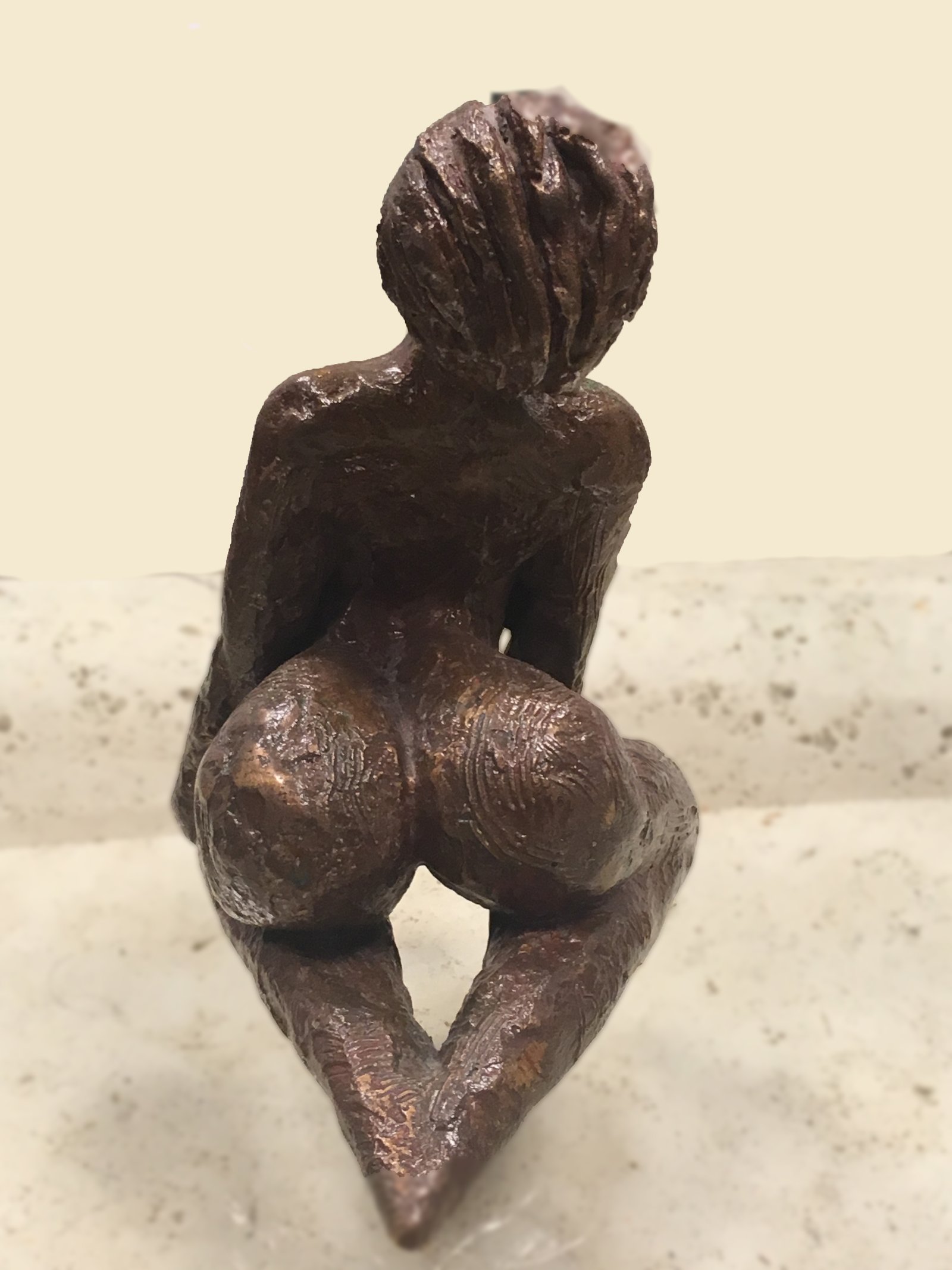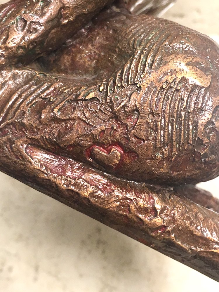 Un bronze de femme où un cœur est apparu spontanément pendant que je finissais l’original en terre. Le cœur a résisté à la cuisson au four puis à la fusion du bronze. Alors je l’ai appelée "Petit cœur". On peut en apercevoir un autre, en tournant la sculpture, selon l’orientation qu’on lui donne, un peu différent mais bien visible. Le voyez-vous ?