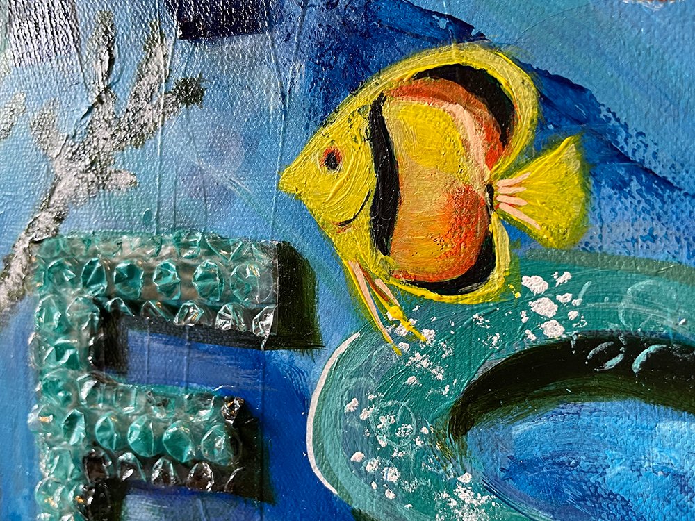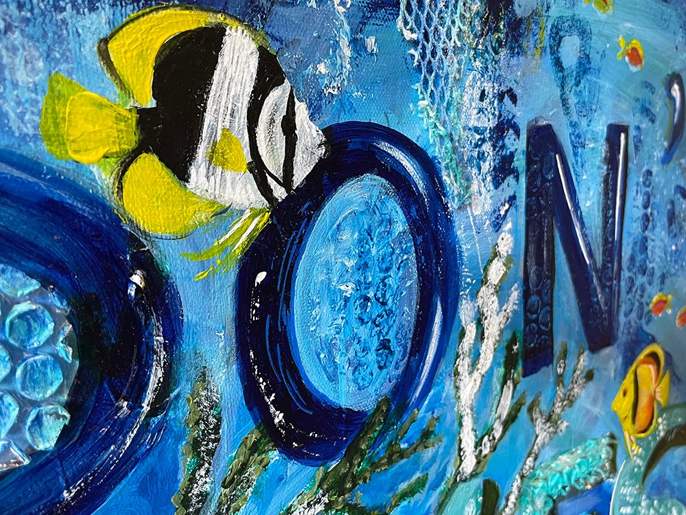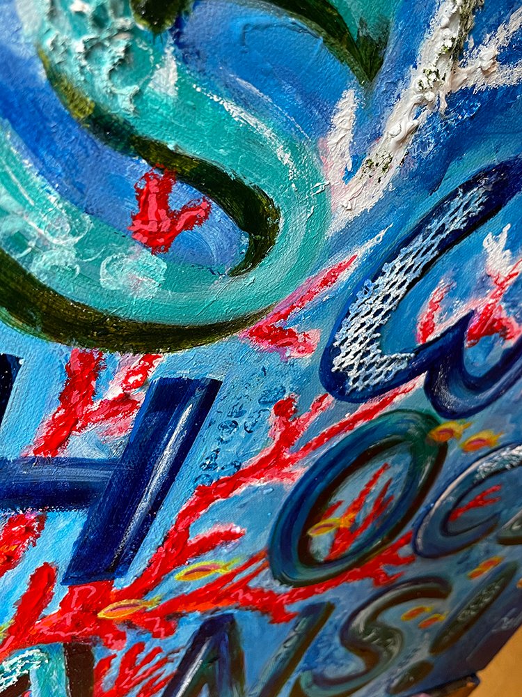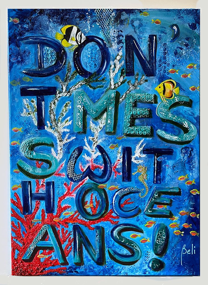 Contrairement aux 6 dernières éditions, au lieu d’une sculpture cette année BELI expose une toile expressément faite à cette occasion, axée sur les océans.