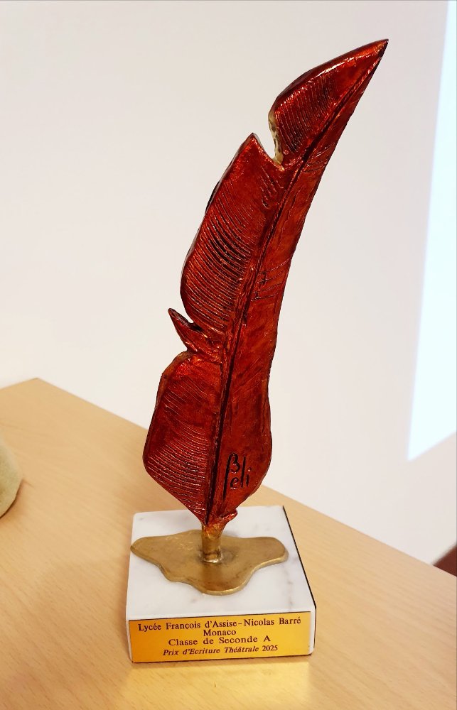 – une grande plume rouge pour le "prix d’écriture théâtrale Jean Cocteau" décerné aux élèves en option théâtre du Lycée FANB de Monaco