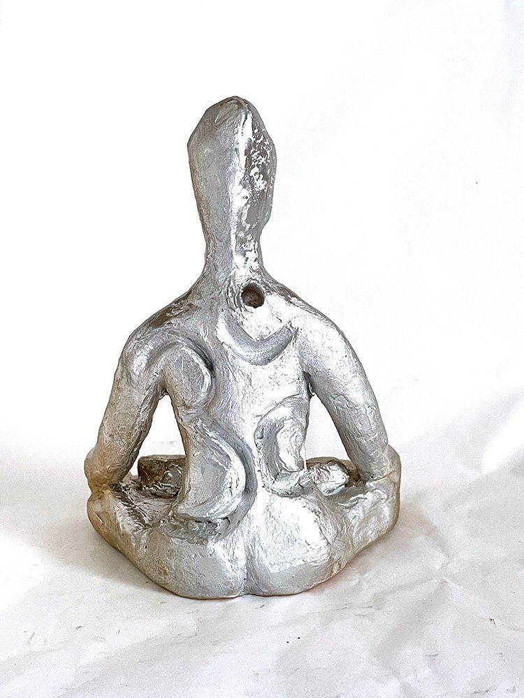 "YOGI" est une œuvre qui symbolise ma transition vers une spiritualité plus profonde. Il s’agit ici d’une yogi, une représentation à ma façon de la figure traditionnelle, inspirée par la force intérieure et la méditation. Sculptée en terre cuite et plâtre, elle adopte la posture du lotus, emblème de paix et de connexion spirituelle. Son corps est gravé de deux symboles sacrés, dont le chakra du cœur, situé sur le devant, évoquant l’amour universel et l’équilibre.